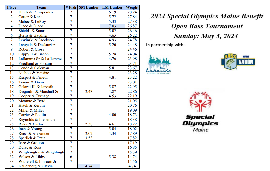 Special Olympics Maine Benefit Open - Cobbosseecontee Lake, Kennebec - May 5, 2024 ResultsJune